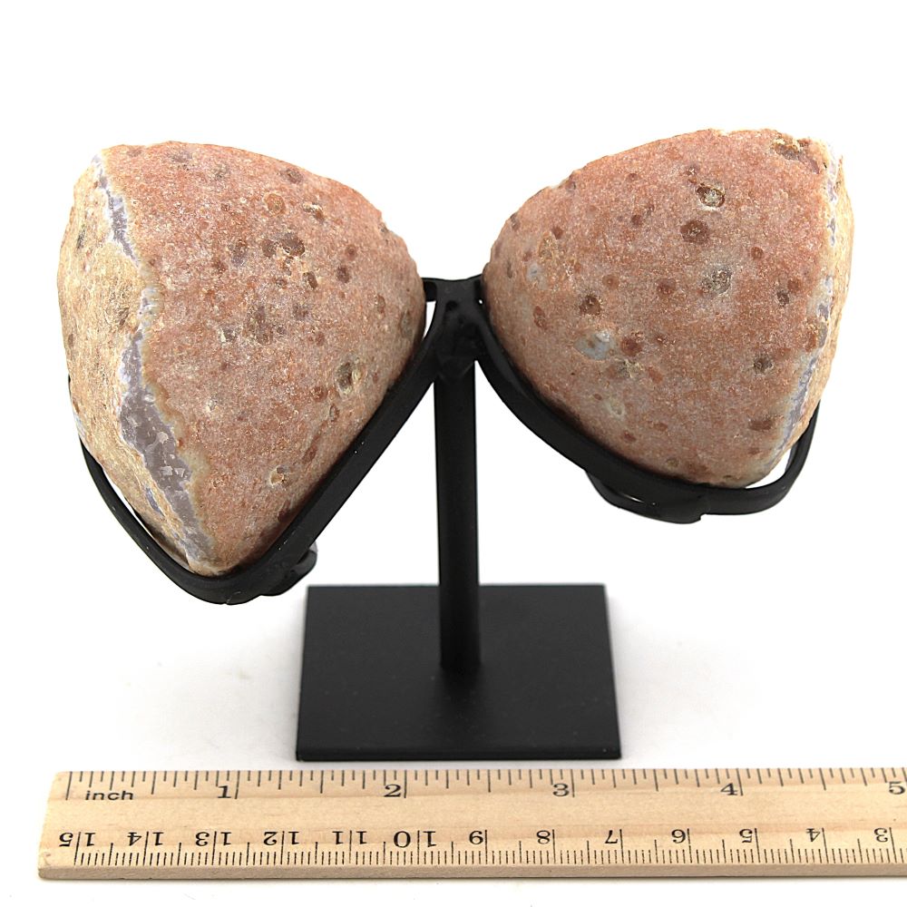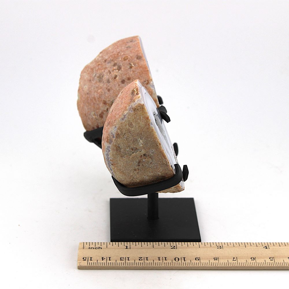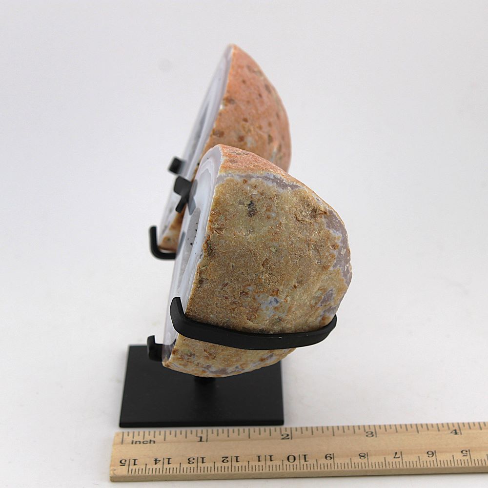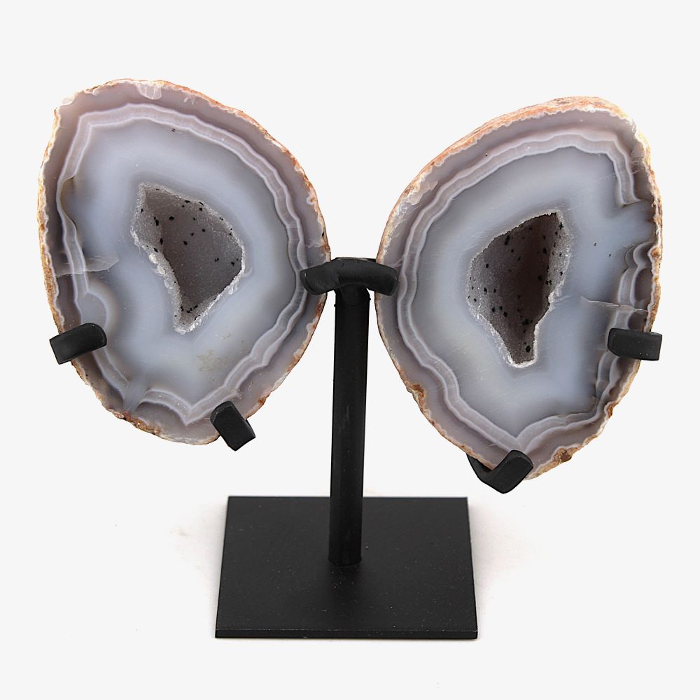 | Product Description | Agate & Quartz geode pair with a custom made metal stand. |
